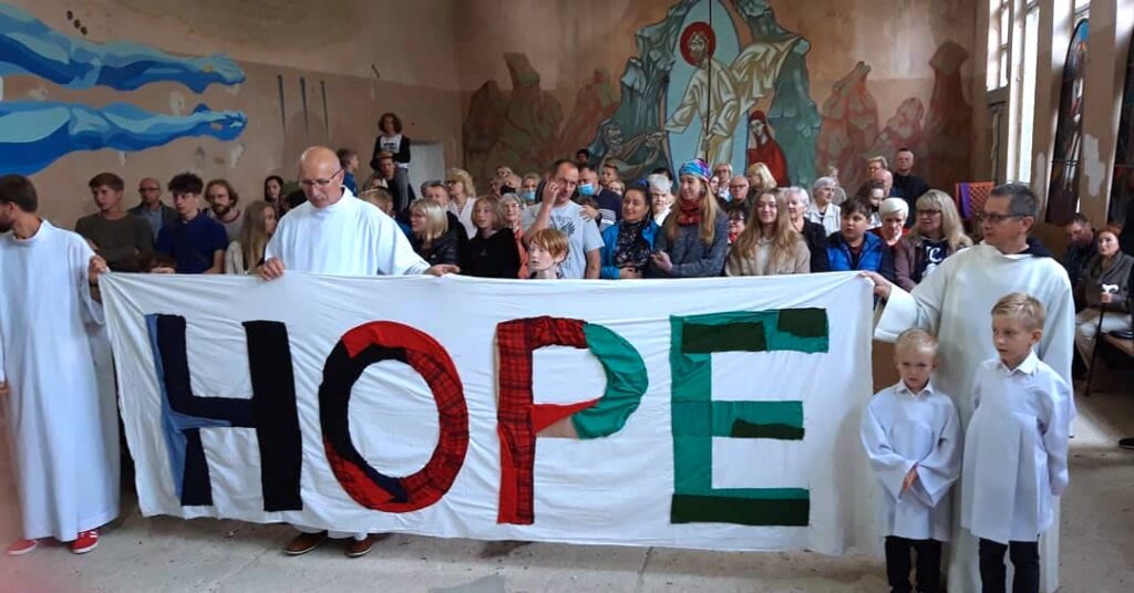 Flaga HOPE po warsztatach stała się motywem przewodnim wokół, którego rozpoczęła się modlitwa w intencji kryzysu migracyjnego podczas wielu Mszy Świętych. Pierwsza z nich, z udziałem Flagi HOPE, odbyła się wraz ze społecznością Siedmiu Aniołów w miejscu prowadzenia warsztatów w Jaczowie, w kaplicy starej szkoły wypełnionej chrześcijańskimi współczesnymi pracami street-art’owymi.